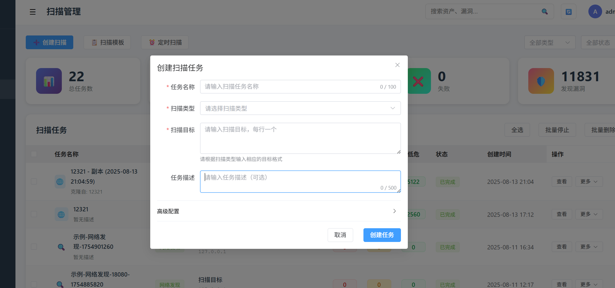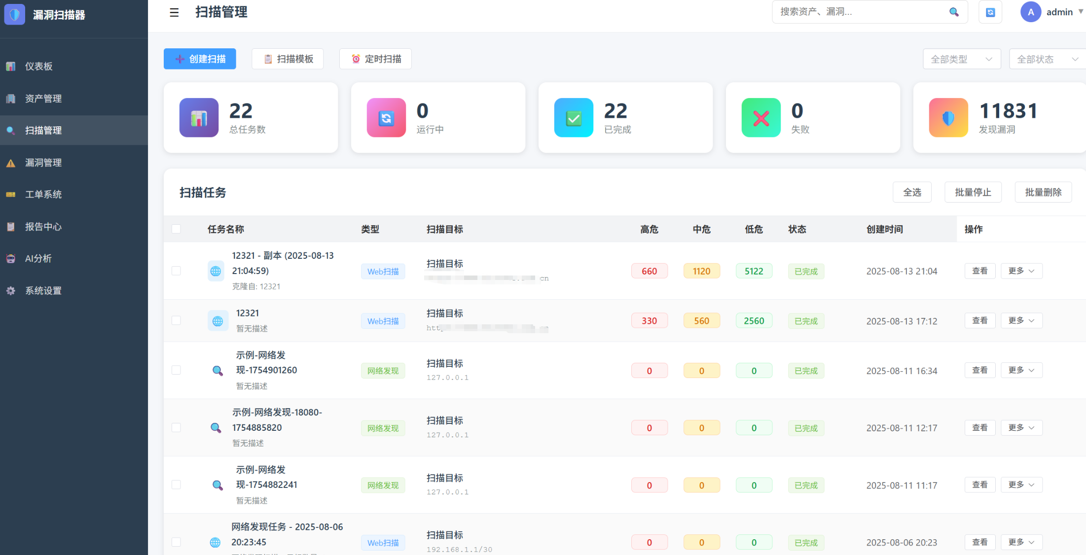2、扫描管理模块能够展示扫描任务列表,包括资产扫描任务和漏洞扫描任务