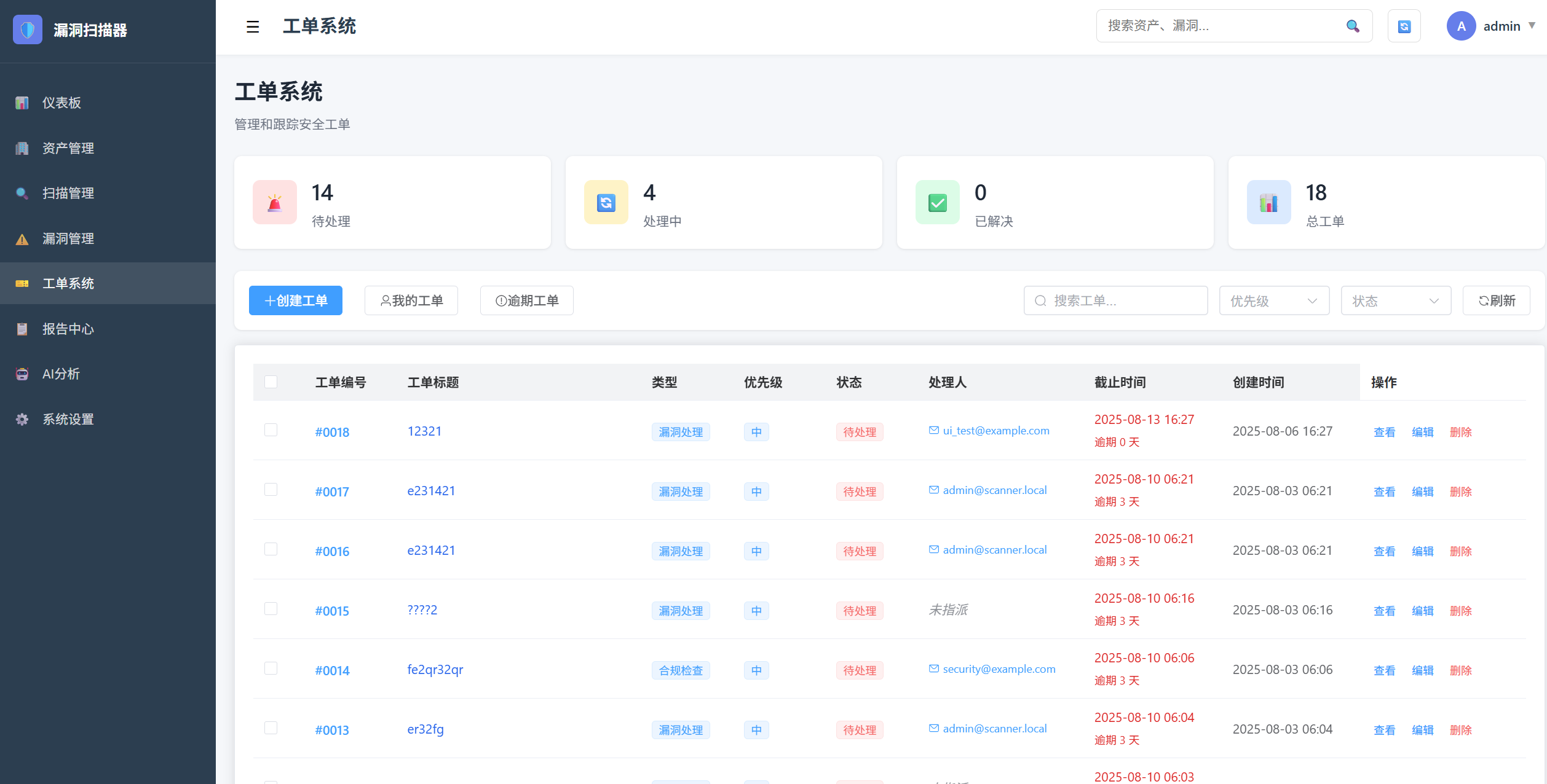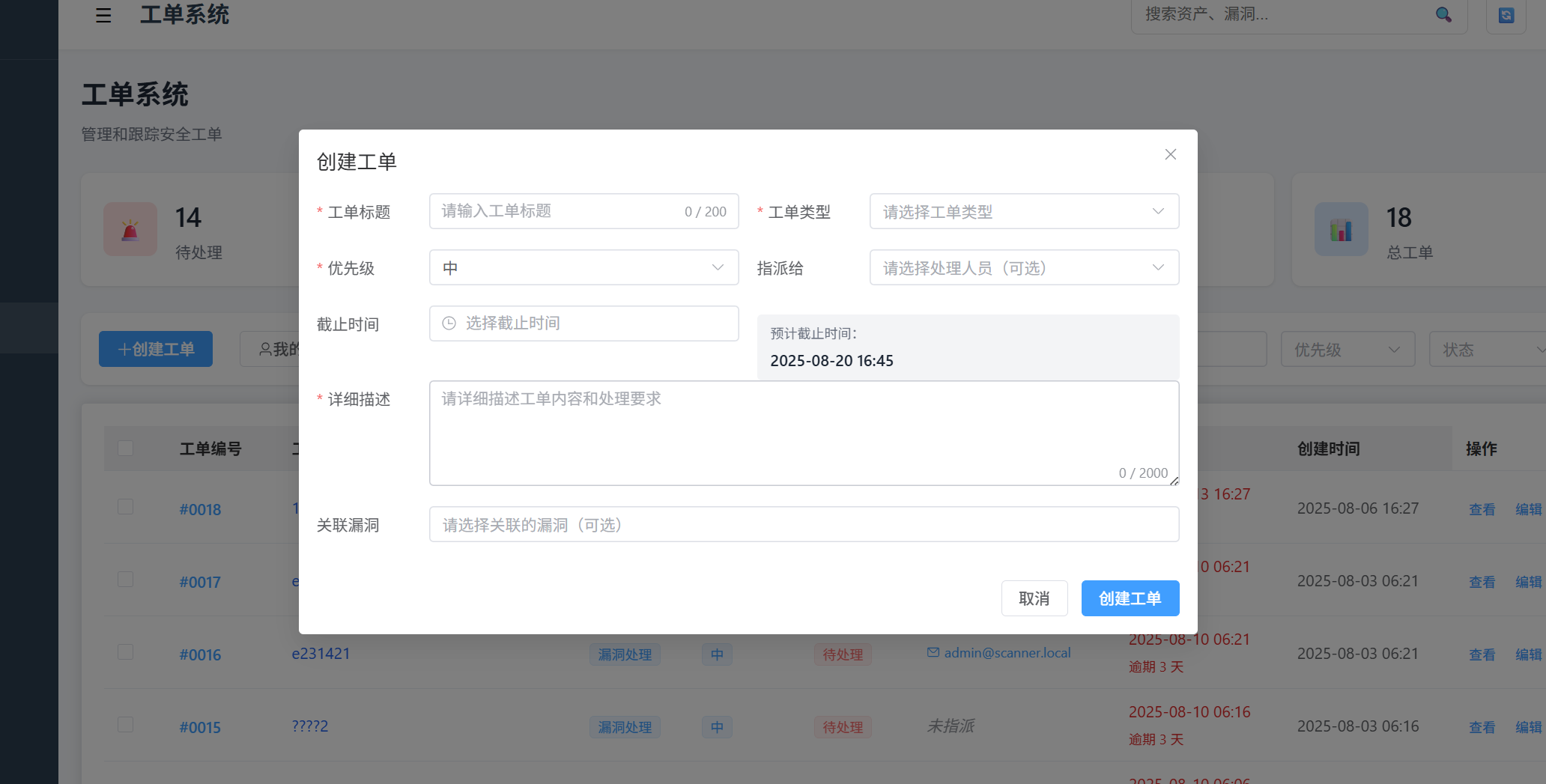 工单系统用于跟踪和管理漏洞的修复情况,具备工单统计、工单展示、工单管理功能。