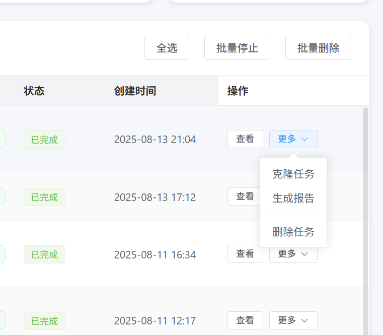 1、扫描管理模块管理功能也即扫描任务的管理,包括扫描任务的开启、停止、删除、克隆和生成报告的能力。