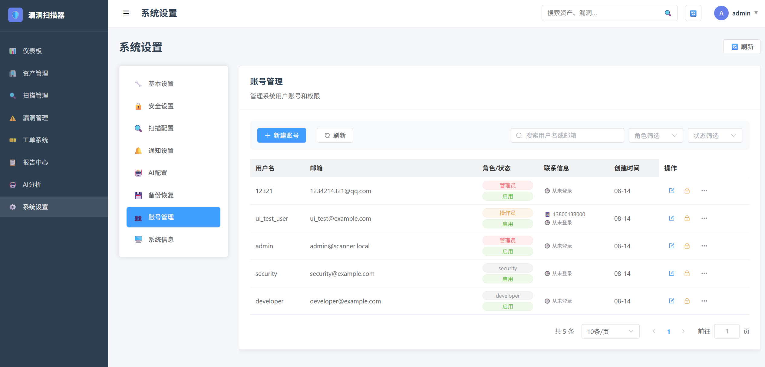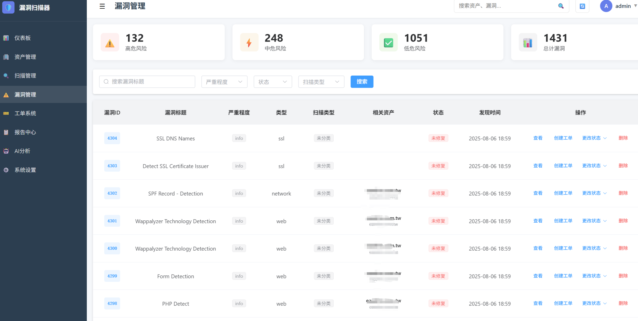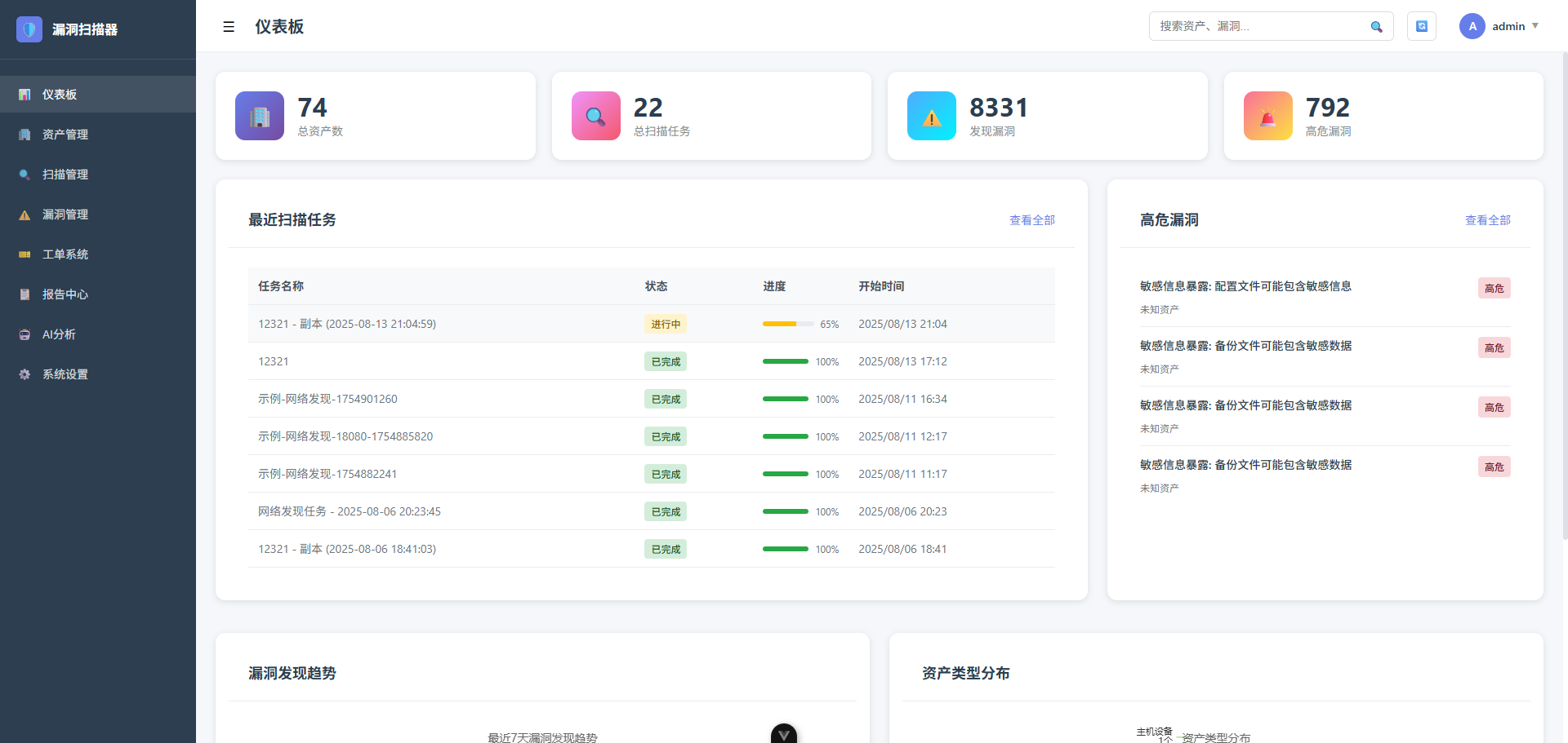 整个产品包括仪表统计模块、资产管理、扫描管理、漏洞管理、工单系统、AI分析、系统设置7大模块