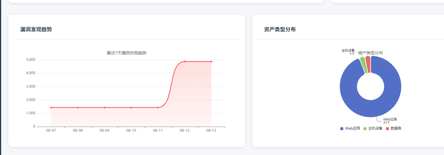 3、图表区:展示最近七条的漏洞发现趋势图以及资产的类型分布图