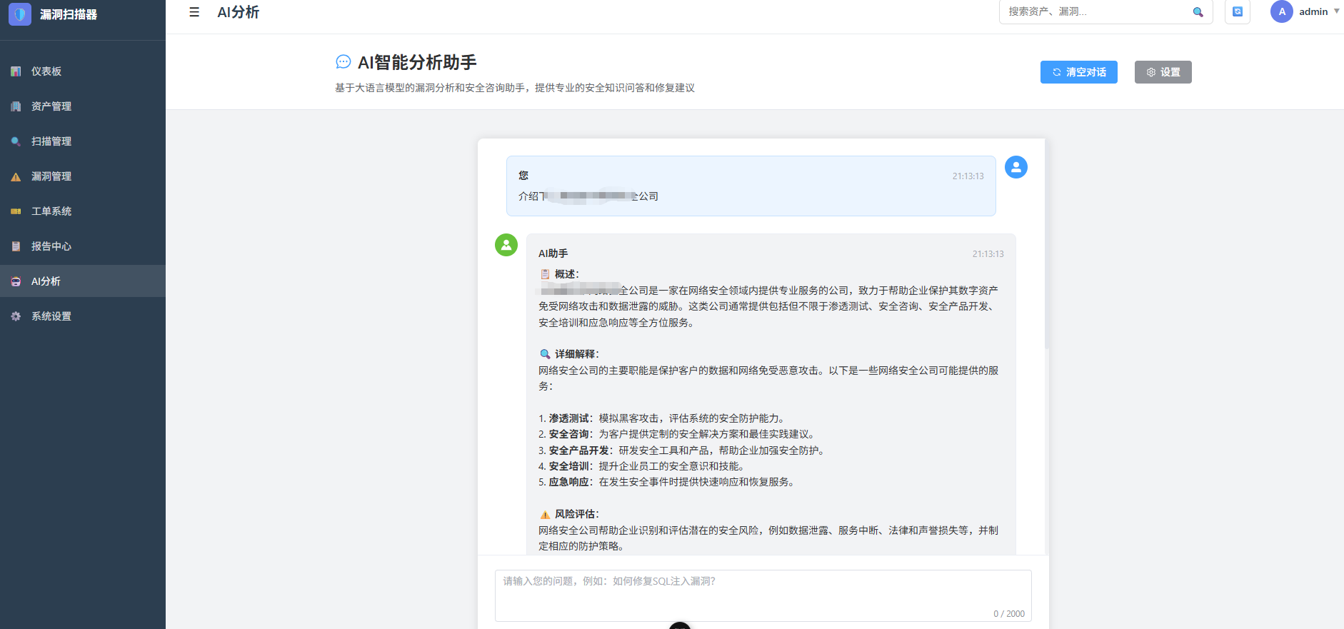 AI分析板块具备AI能力,能够以一个安全专家视角辅助进行漏洞分析、代码分析、修复指引等操作,可以接入deepseek、通义乾问、kimi等大模型。