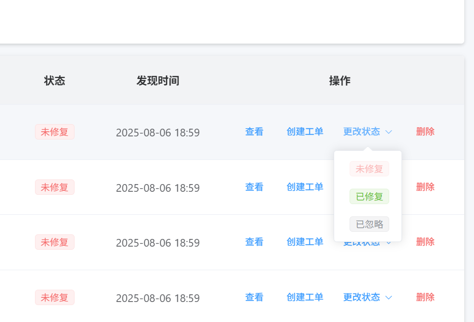在管理上,能够查看/删除漏洞,也能够创建漏洞工单以及更改漏洞状态